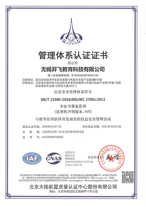 信息安全管理體系認(rèn)證證書(2020.9.17-2023.9.16)