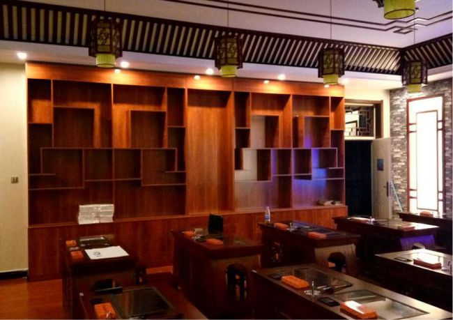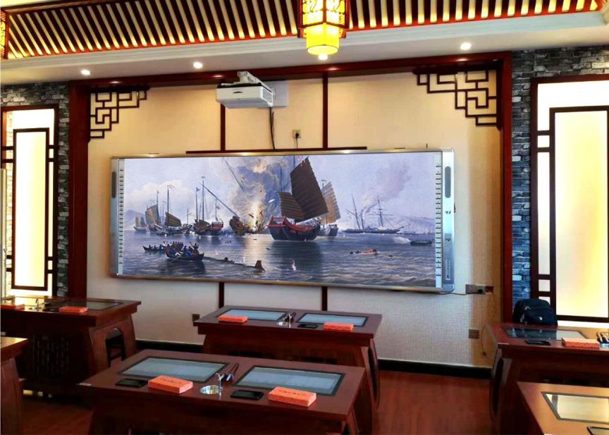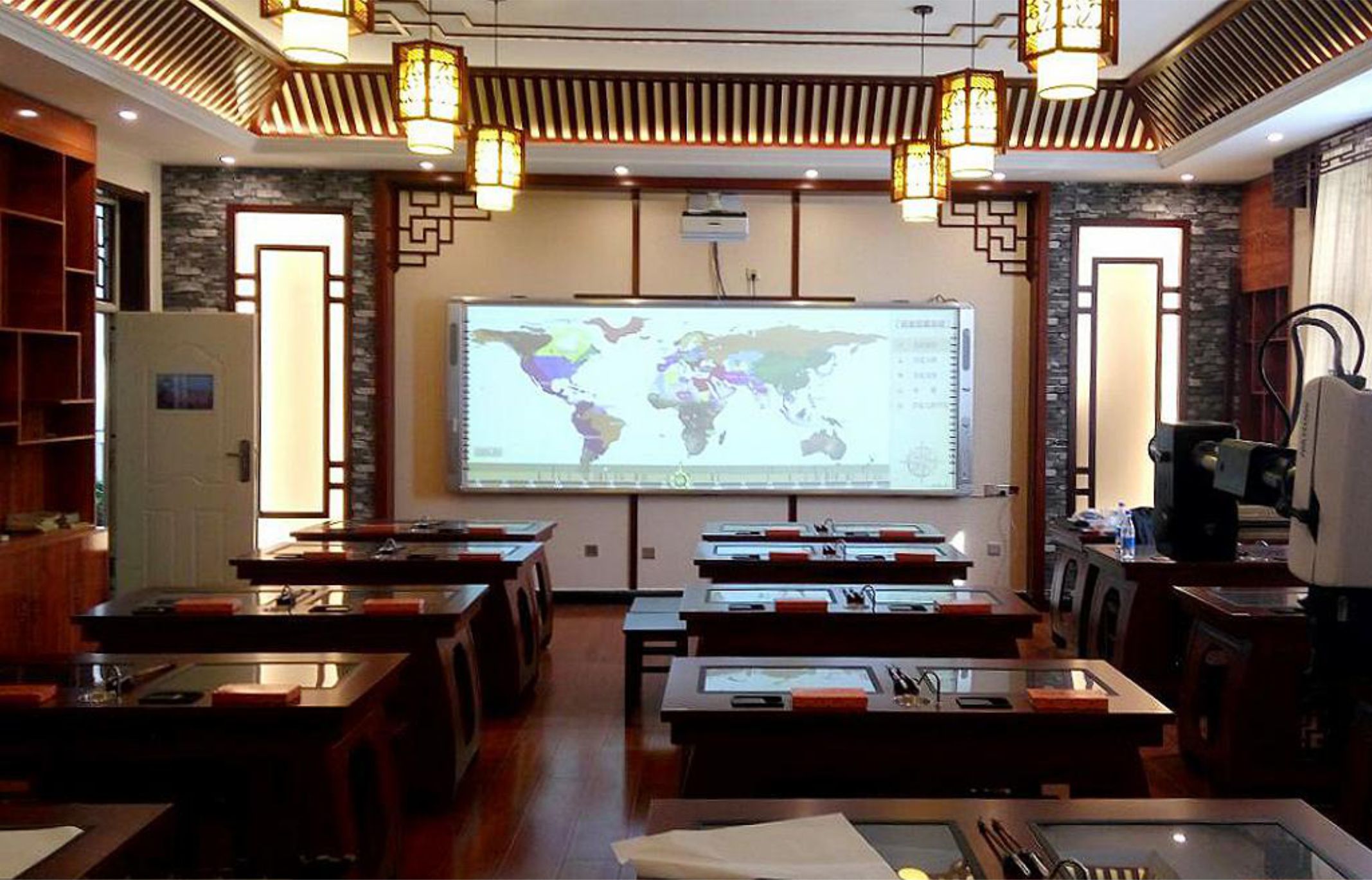 從走進教室,博物架、仿古壁紙、古色古香的方格鏤空花雕隨處可見,文房四寶靜置于木質(zhì)長桌上,長桌玻璃鏡面內(nèi)置全息書法字庫、書法課件播放系統(tǒng)、字帖生成系統(tǒng)等,學生可以直接將宣紙鋪在桌上臨摹,即可練習書法。環(huán)顧周圍,你會看到各個時期的器物,如周朝的青銅方鼎、春秋時期的戰(zhàn)車、明清的仿瓷以及很多國學大師的經(jīng)典語錄,整間教室都充滿著靜謐,流淌著淡淡墨香。