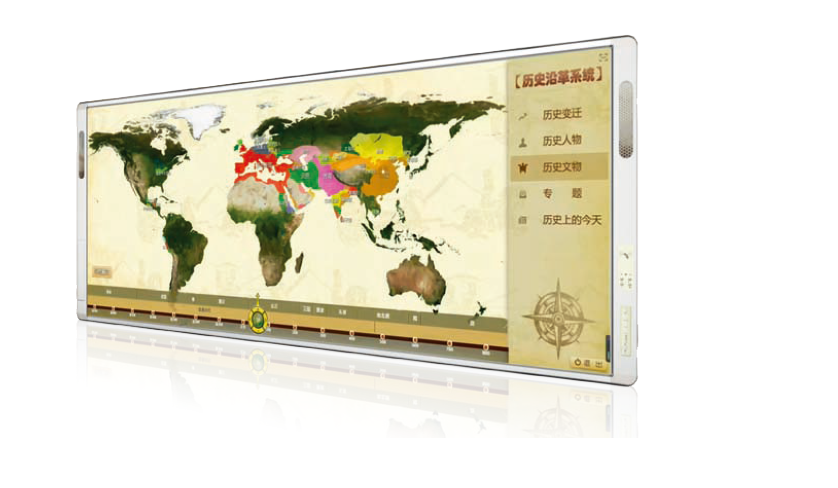 數(shù)字歷史沿革系統(tǒng)采用了新型的激光投影、紅外集成觸控技術(shù)。它選取了中國及世界歷史中典型的人物、事件等素材,將這些素材以時間軸順序展開,與教學(xué)課件有機(jī)結(jié)合。歷史沿革系統(tǒng)以人類社會發(fā)展的趨勢為視角、以重大歷史政治、經(jīng)濟(jì)、科學(xué)文化事件為架構(gòu)和主體,具有圖、文、聲、視功能,四位一體地展示中外歷史發(fā)展的文明。